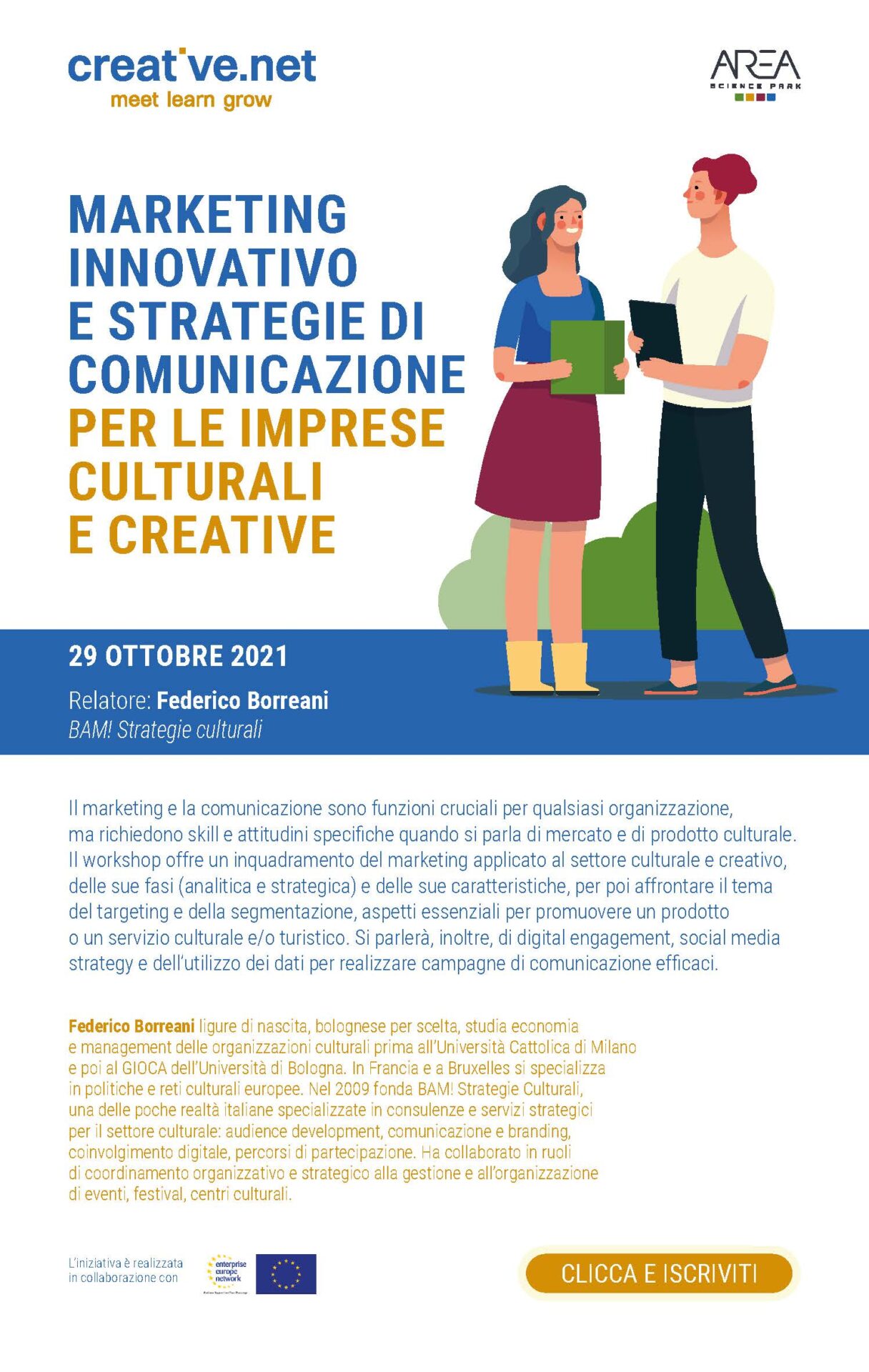 Il marketing e la comunicazione sono funzioni cruciali per qualsiasi organizzazione, ma richiedono skill e attitudini specifiche quando si parla di mercato e di prodotto culturale. Il workshop, in programma il prossimo 29 ottobre 2021 dalle 9 alle 11, offre un inquadramento del marketing applicato al settore culturale e creativo, delle sue fasi (analitica e strategica) e delle sue caratteristiche, per poi affrontare il tema del targeting e della segmentazione, aspetti essenziali per promuovere un prodotto o un servizio culturale e/o turistico. Si parlerà, inoltre, di digital engagement, social media strategy e dell’utilizzo dei dati per realizzare campagne di comunicazione efficaci.