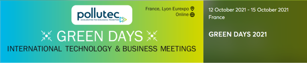 La fiera Pollutec è il punto d’incontro di riferimento per le aziende e organizzazioni dell’ambiente. GREEN DAYS è l’evento B2B ufficiale della fiera Pollutec e questo evento B2B è dedicato a PMI, Gruppi, Centri di ricerca, Agenti, Distributori, Investitori, Cluster ecc. dei settori dell’ambiente, dell’energia e dell’economia circolare.